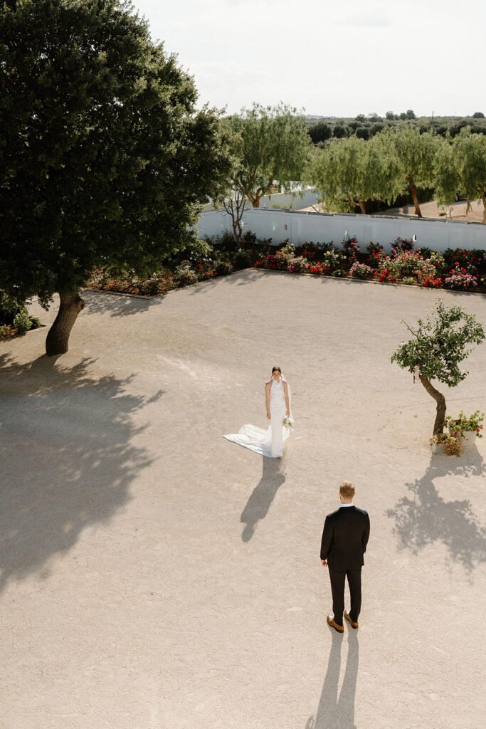 Book early, across every supplier category. The most sought-after Puglia wedding venues, including Calderisi, Potenti, and Borgo Egnazia, are frequently reserved 18 to 24 months ahead of peak dates. Peak season runs from May through June and September through October: consistent warmth, reliable weather, and the warm amber quality of light that defines Puglia at its finest. July and August are intensely hot. Outdoor ceremonies in those months require careful planning around shade, timing, and guest comfort.